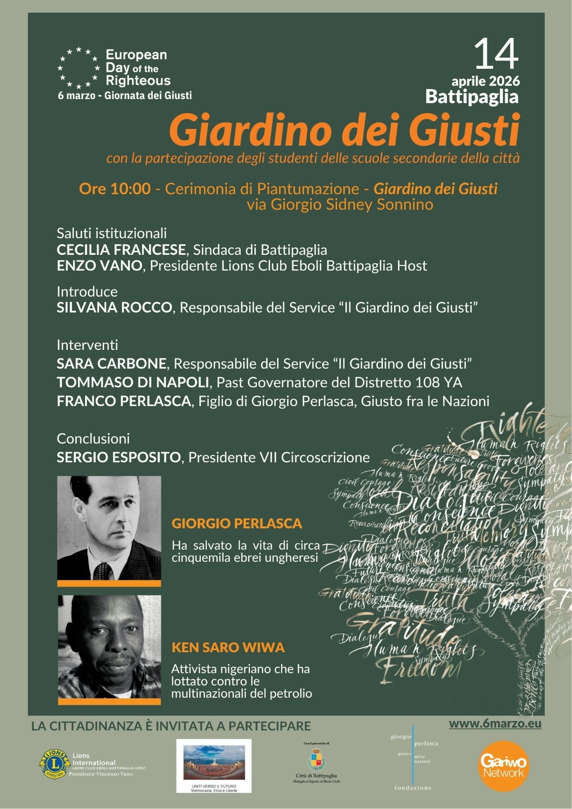 A Battipaglia nell’ambito del Service, “Il Giardino dei Giusti” promosso dal Lions Club Eboli Battipaglia Host, con il patrocinio del comune di Battipaglia (SA), le scuole della città, del primo e del secondo ciclo, incontreranno Franco Perlasca presso il Salotto comunale in orario antimeridiano (dalle 9:30 alle 11:30). Saranno coinvolti gli studenti delle: terze medie I.C.Gaetano Salvemini, IC. Alfonso Gatto, IC. Guglielmo Marconi e IC. Fiorentino e gli studenti del primo biennio delle scuole secondarie di Secondo Grado Liceo “Enrico Medi”, IIS “Besta Gloriosi”, IIS “Enzo Ferrari” e ISS “Profragri”. Qui la locandina.