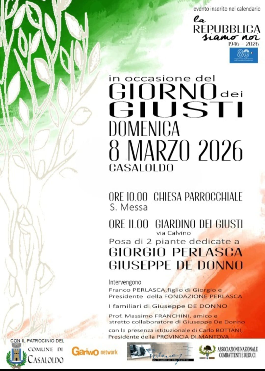 A Casaloldo (Mn) alle ore 10.00 S. Messa alla Chiesa Parrocchiale e alle ore 11.00 al giardino dei Giusti posa di due piante dedicate a Giorgio Perlasca e Giuseppe di Donno. La locandina.
