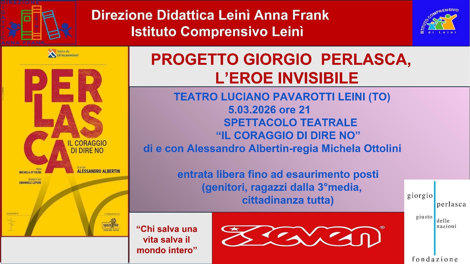 A Leinì (To) al teatro Pavarotti nell’ambito del progetto ”Giorgio Perlasca, l’eroe invisibile” dell’Istituto comprensivo di Leinì incontri sulla figura di Giorgio Perlasca. La locandina.